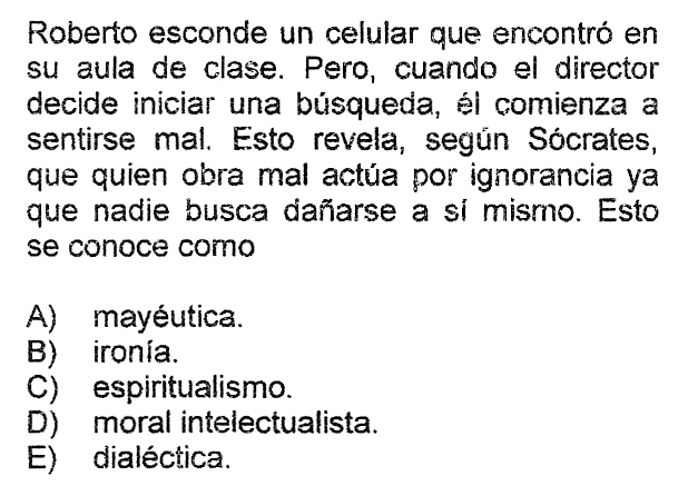 - 7. La ironía socrática constituía un momento indispensable, ya que _________________ A) los interlocutores debían admitir su propia ignorancia. B) plantea la existencia de dos mundos distintos. C) conducía a la definición de las ideas universales D) el sarcasmo era característico de los argumentos socráticos. E) nos conduce al conocimiento múltiple de las opiniones.