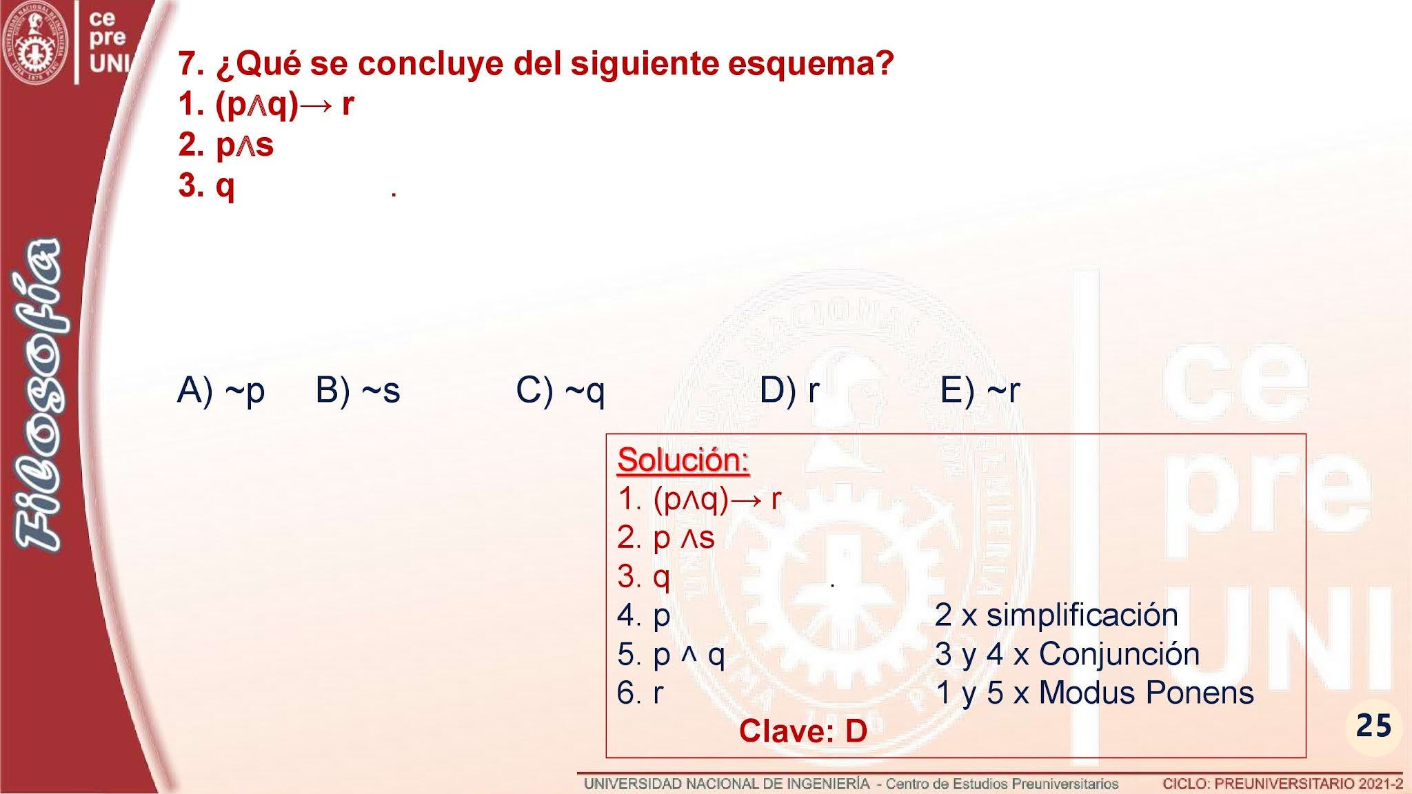 (SD) (el modo que, al negar, afirma) | p ∨ q ~p ——— ∴ q | Estudias historia o matemáticas